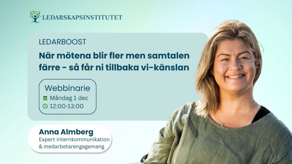 Ledarboost! När engagemanget dalar och teamet tappar riktningen handlar lösningen sällan om fler möten. Hör Anna Almberg visa hur du som chef återskapar vi-känslan och samhörigheten i gruppen.